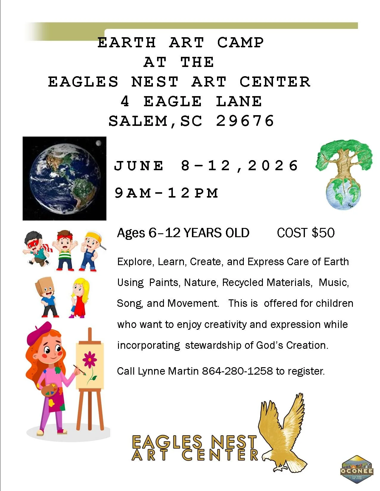 Have fun each day at the Earth Art Camp Monday through Friday 9AM-12PM. Bring your own snack and water bottle. Call for Registration!
